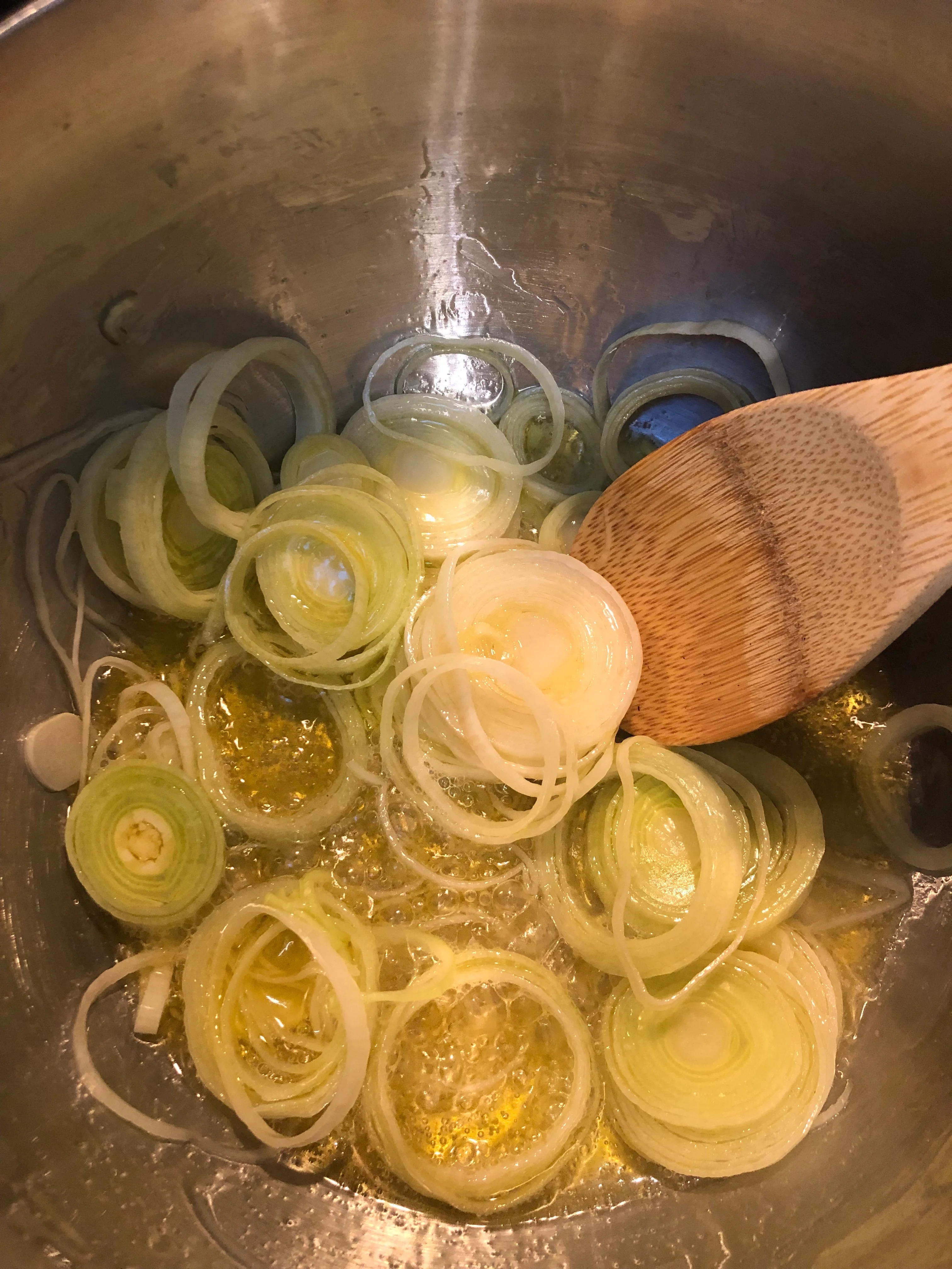 - Dice the leeks. Preheat the saucepan with ghee and saute leeks for 10 min or until it is soft and translucent.