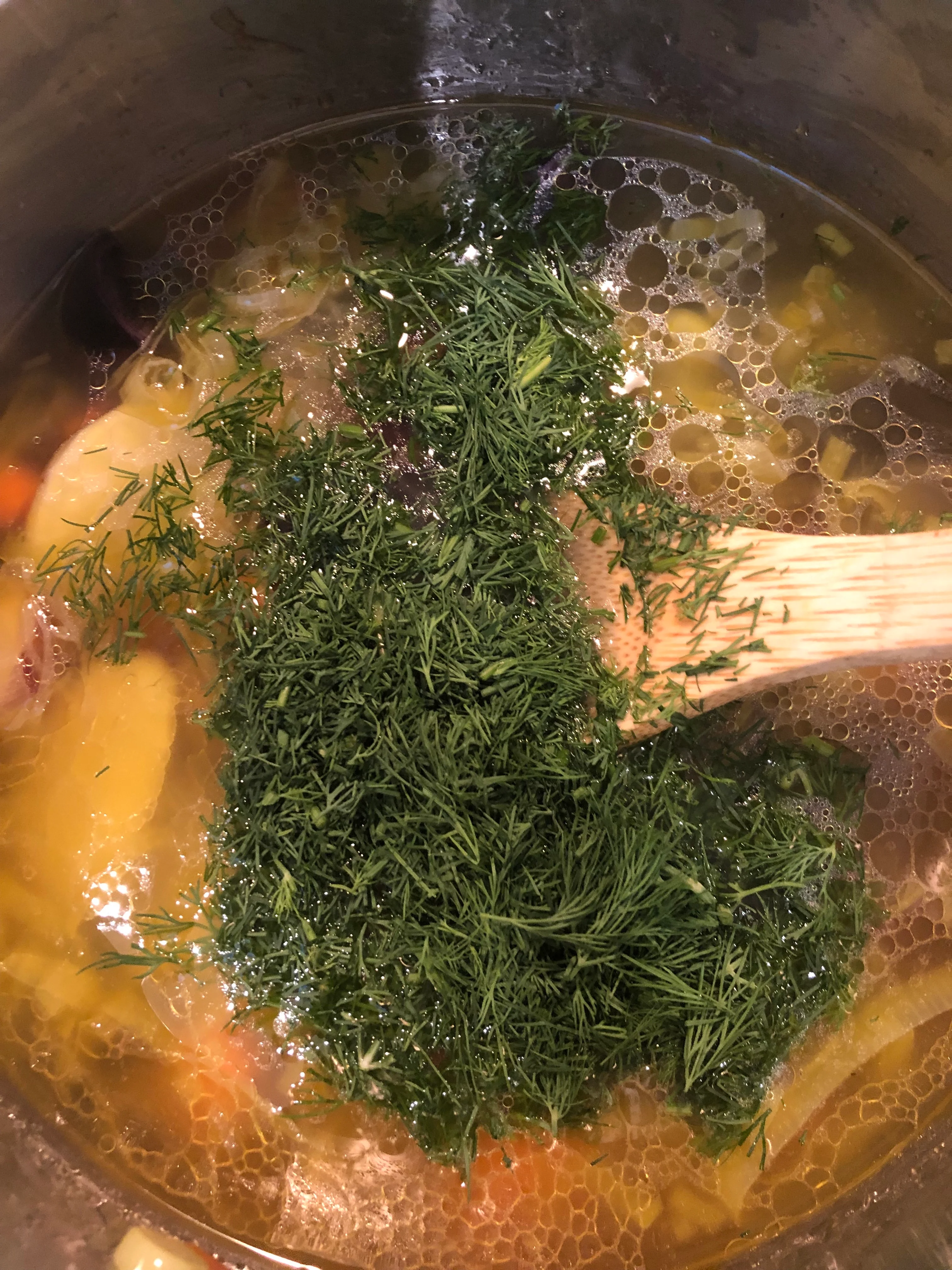 - Once the leeks are done, add to them clam juice, 2 cups water, potatoes, carrot, half of dill.